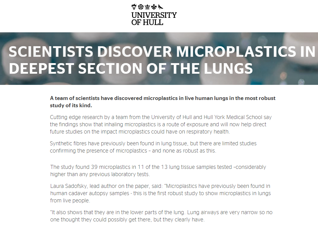 A team of researchers from the University of Hull and Castle Hill Hospital, both in the U.K., has identified minute particles of plastic in lung tissue removed from live human patients, marking the first time such materials have been observed in living human patients. The group has published a paper describing their findings in the journal Science of the Total Environment.