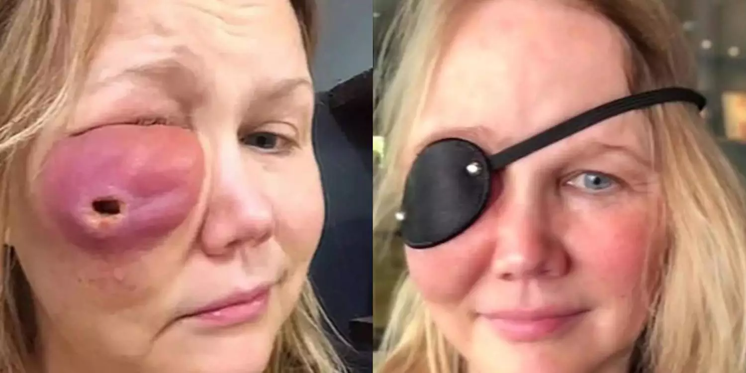 Mas, quatro anos depois de terminar o trabalho, Gina notou uma reação horrível. A neurologista descobriu um granuloma gigante - uma área de inflamação - próximo o olho direito.