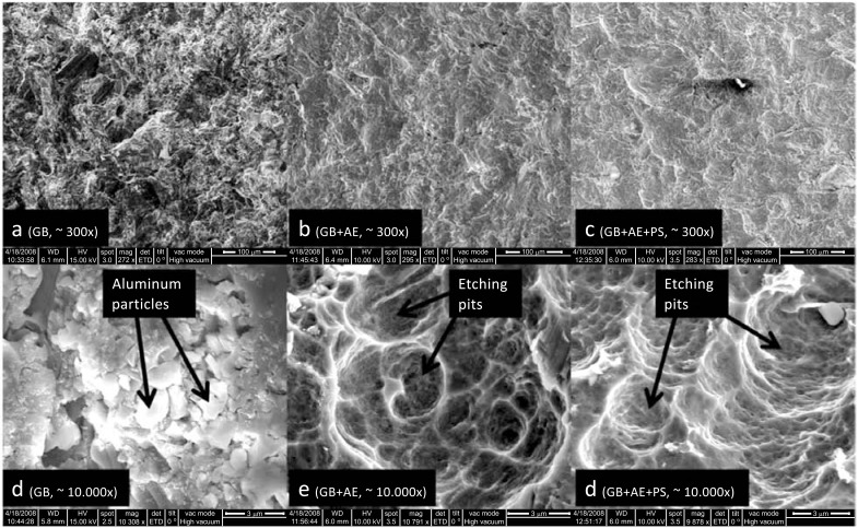 Figure 3: SEM pictures of the implant surfaces: In picture D, crystals of aluminum oxide (Al2O3 particles) from the grit blasting are clearly visible.