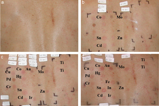 Results of patch tests. (a) Upper back before patch testing. (b) Result of patch testing at 48 h. (c) Result of patch testing at 72 h. (d) Result of patch testing at 1 week.