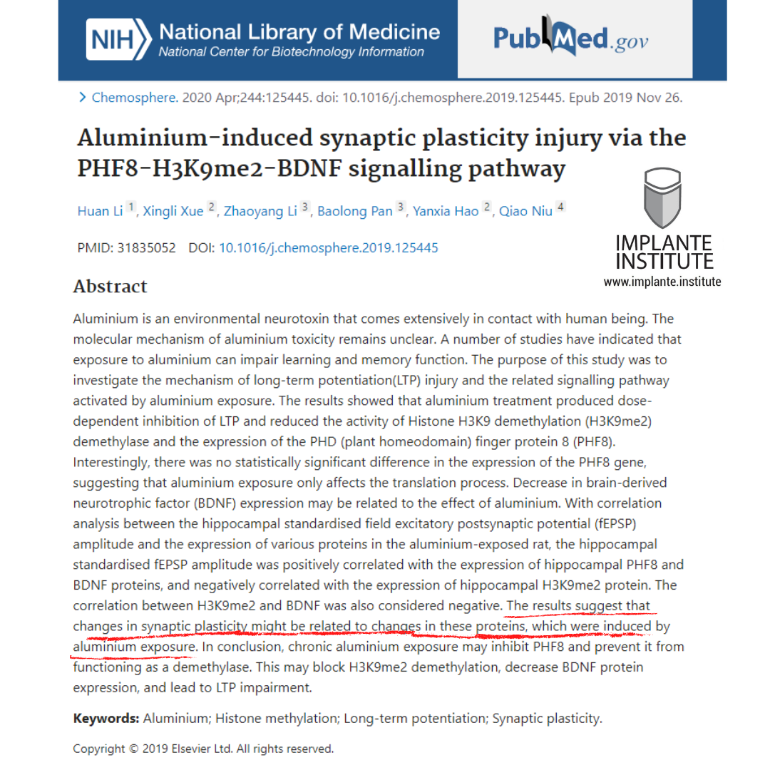The results showed that aluminium treatment produced dose-dependent inhibition of LTP and reduced the activity of Histone H3K9 demethylation (H3K9me2) demethylase and the expression of the PHD (plant homeodomain) finger protein 8 (PHF8).