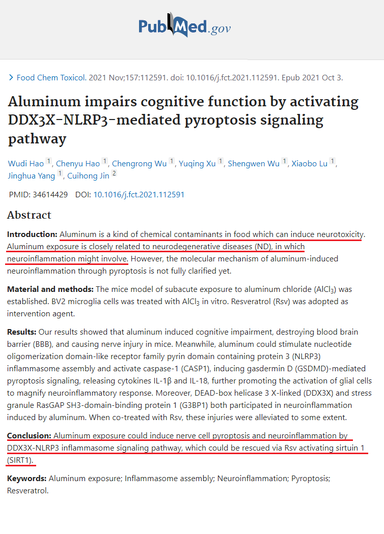 Conclusion: Aluminum exposure could induce nerve cell pyroptosis and neuroinflammation by DDX3X-NLRP3 inflammasome signaling pathway, which could be rescued via Rsv activating sirtuin 1 (SIRT1).