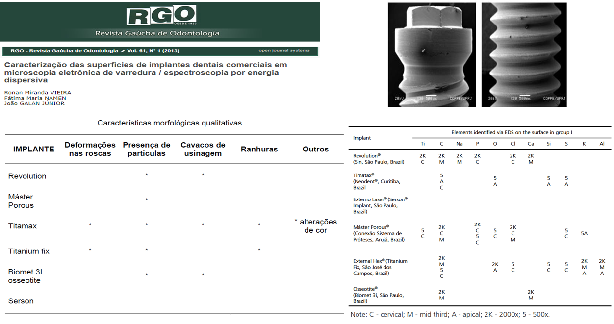 Characterization of the surfaces of dental implants commercial in scanning electron microscopy / energy dispersive spectroscopy / Caracterização das superfícies de implantes dentais comerciais em microscopia eletrônica de varredura / espectroscopia por energia dispersiva