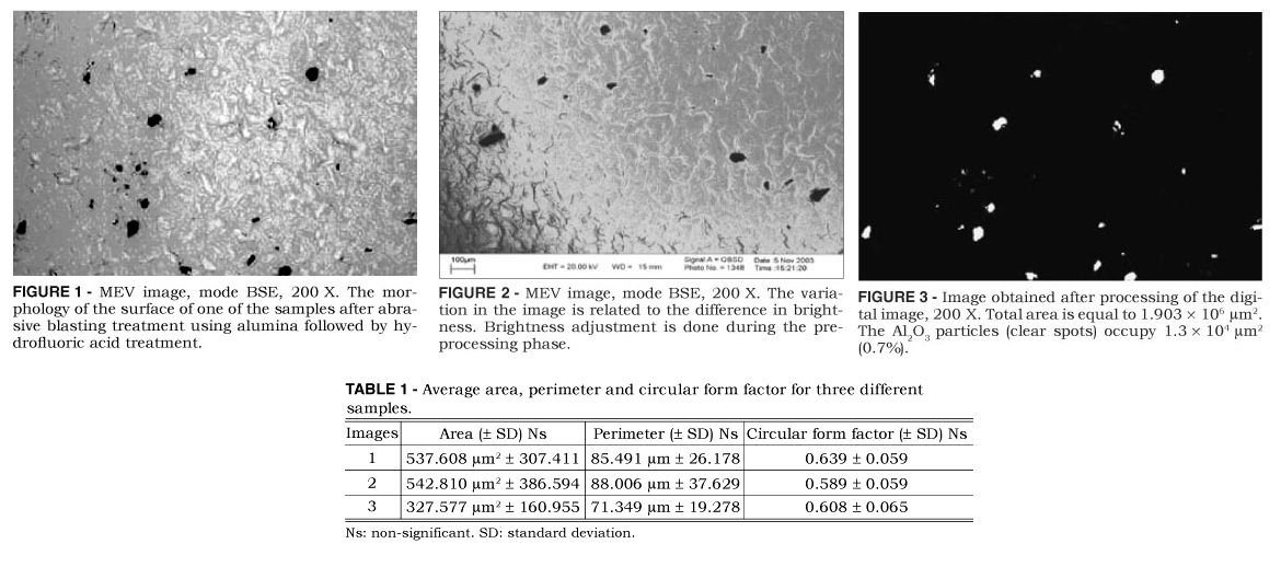 Grade II titanium plates (ASTM B265-58T) submitted to mechanical and chemical treatment were used to reproduce implant surfaces. The titanium plates were submitted to blasting processes using particles of aluminum oxide (Al2O3) with average diameter of 65 µm and direct pressure of 138 kPa. Three plates were cut into 20 x 20 mm square samples and cleaned by ultrasonic bath, followed by a hydrofluoric acid-based solution (HF) treatment. The treatment process was done in two different stages: the first using a solution of 4% HF during 60 seconds and the second using a solution of both 4% HF and 8% H2O2 during 15 seconds. Both stages were performed at room temperature under an exhaustion system. Three digital images from each sample surface were obtained and half-quantitative chemical analyses were performed using Scanning Electron Microscopy (SEM) (JEOL JSM 6301F, Peabody, MA, USA) and Electron Dispersive Spectroscopy (EDS) (Voyager XRMA System, Noran Instruments, Madison, WI, USA). In addition, parameters related to the alumina phase such as the concentration level, the area and perimeter of all the particles and their circular form factor were measured using the KS 400 image processing program (Carl Zeiss, Oberkochen, Germany). After adjusting the brightness and contrast levels of the images, processes of segmentation, post-processing and quantification were performed.