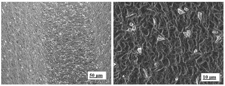 Particles of alumina (left) and titanium oxide (right) encrusted on the sandblasted implant surface.