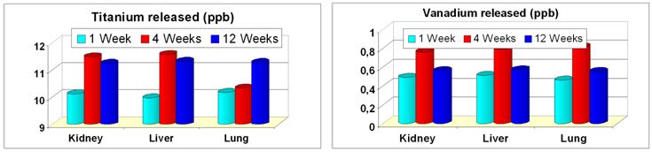 Levels of metallic ions released from orthodontic Ti-6Al-4V mini-implants inserted in rabbits. (A) Ti (ppb). (B) V (ppb). Adapted from Morais et al. (Morais et al., 2009)
