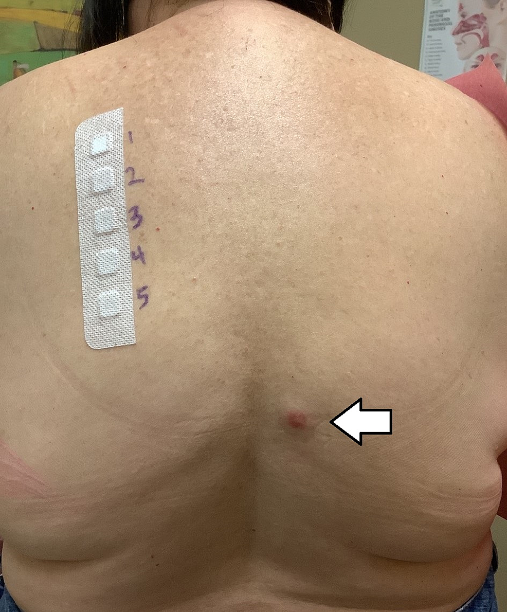 Erythematous papule (white arrow) denotes positive test for gold sodium thiosulfate.