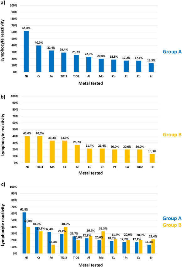 Results of the lymphocyte reactivity to metal salts in Group B controls are presented in Fig. 1b and are in the order: nickel and titanium (in the form of chloride) (40%), molybdenum and chromium (33.3%), aluminum (26.7%), copper and zirconium (21.4%), platinum, cobalt and titanium (in the form of oxide) (20%) and iron (13.3%), respectively.