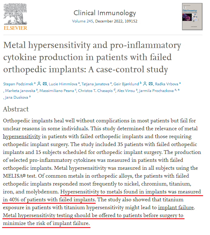 In this study, 40% of patients with failing implants had hypersensitivity reactions to a metal present in their implant, as measured by the MELISA® test. In these patients, the production of pro-inflammatory cytokines was influenced the most by titanium stimulation in patients with diagnosed titanium hypersensitivity. Titanium exposure in patients with titanium hypersensitivity may lead to titanium implant failure. To minimize the risk of implant failure, metal hypersensitivity testing should be offered to patients (especially those with autoimmune diseases, asthma, and/or allergies) before surgery. This would enable the most appropriate implant material to be selected.