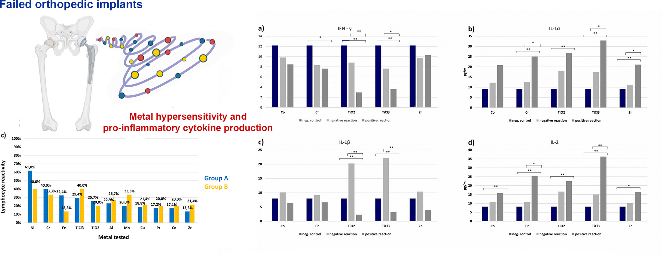 However, the risk of implant failure must be minimized and, ideally avoided, in advance. This study aimed to determine metal hypersensitivity in subjects who required orthopedic implant surgery and in patients with failed orthopedic implants, as well as monitor the production of selected pro-inflammatory cytokines in patients with failed orthopedic implants.