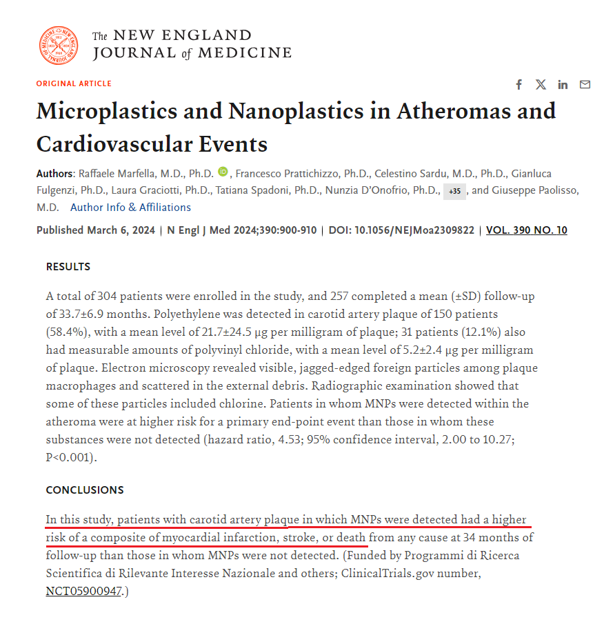 Neste estudo, pacientes com placa na artéria carótida nos quais foram detectadas MNPs apresentaram maior risco de um composto de infarto do miocárdio, acidente vascular cerebral ou morte por qualquer causa aos 34 meses de acompanhamento do que aqueles nos quais não foram detectadas MNPs. (Financiado por Programmi di Ricerca Scientifica di Rilevante Interesse Nazionale e outros; número ClinicalTrials.gov, NCT05900947.)