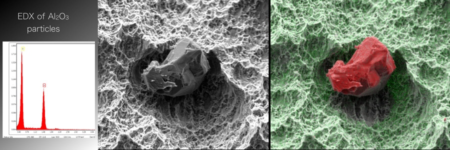 The number of particles in each ROI was determined and the particles were marked and numbered. The size of each particle was measured using imaging software and particles smaller than 10 micrometres were discounted. An image of each particle was also taken and its elemental composition determined using EDX (Energy-Dispersive X-ray) spectroscopy with backscatter electron SEM detector.