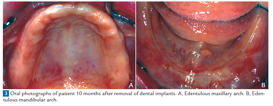 Therefore, all of the implants were surgically removed in July 1998 with the patient’s consent. One week later, the symptoms of eczema temporarily worsened (Fig. 1, B). However, the symptoms thereafter gradually improved, without requiring the prescription of any oral or topical medications, and complete resolution was achieved within 10 months (Fig. 1, C, and Fig. 3). The patient did not desire to undergo any further implant placement. Although the retention and stability of the mandibular denture were reduced without implants for support, the denture has since been managed by denture relining, and it has functioned acceptably to date. When the patient was last seen in April 2008, she was doing well and had no signs of recurrence.