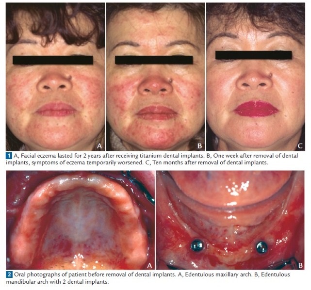 However, the relationship between titanium dental implants and clinically relevant  hypersensitivity has been recently suggested.26,27 These reports raise the question that metal sensitivity may arise after exposure to titanium for some patients in certain circumstances. This clinical report demonstrates the emergence of eczema localized to the perioperative facial area after receiving titanium dental implants, in which a complete  emission was subsequently achieved by the removal of the titanium material.