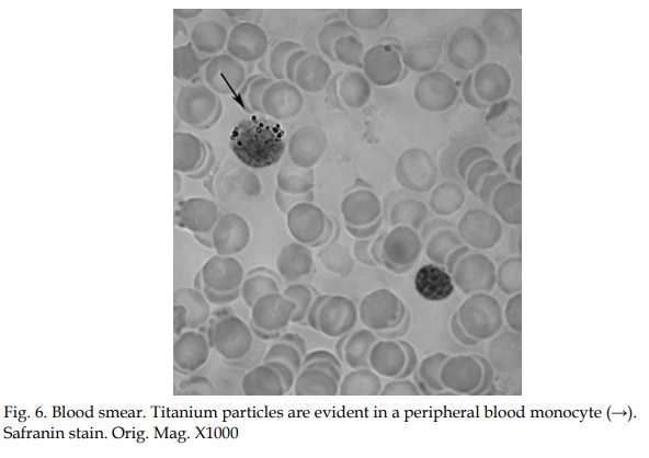 As previously stated, all the metallic materials employed in surgery as permanent implants are liable, to a certain degree, to corrosion due to variations in the internal electrolyte milieu (Jacobs, 1998). Corrosion, one of the possible causes of implant failure, implies the dissolution of the protective oxide layer. When metal particles/ions are released from the implant surface, they can migrate systemically, remain in the intercellular spaces near the site where they were released, or be taken up by macrophages (Olmedo 2003, 2008b). The presence of metallic particles in peri-implant tissues may not only be due to a process of electrochemical corrosion but also to frictional wear, or a synergistic combination of the two.