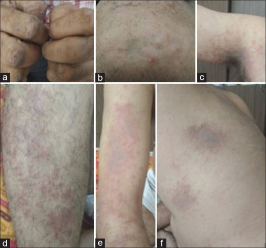 Preoperative presentation of the patient showing eruptions and erythema on (a) fingers, (b) chin, (c) axilla, (d) legs, (e) arms, and (f) back