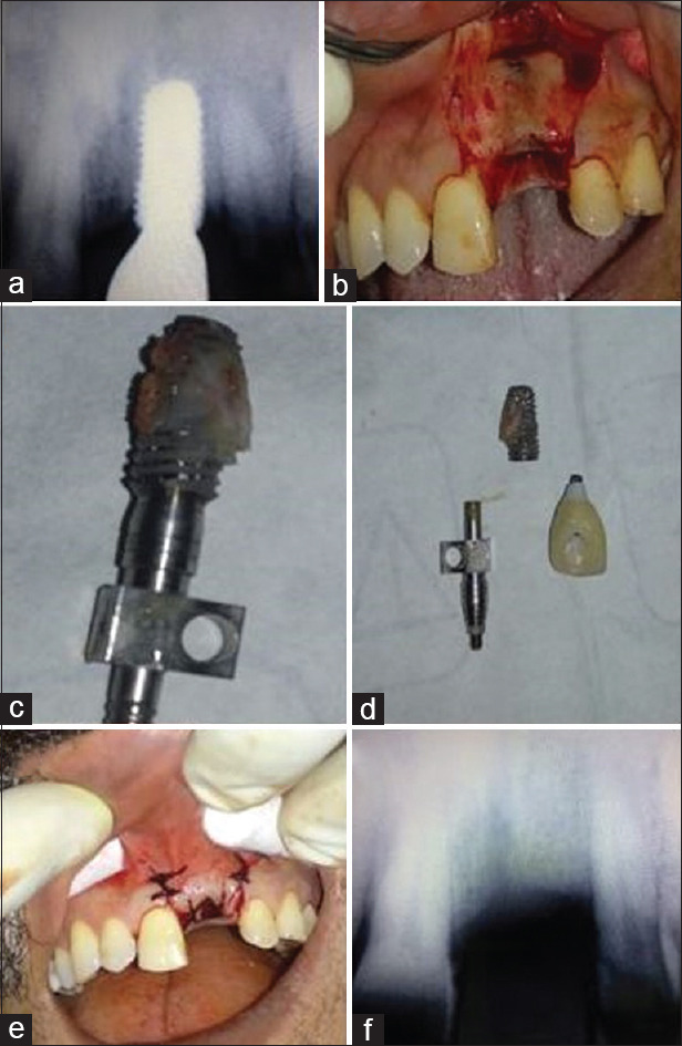 Intraoperative surgical implant removal, (a) presurgical radiograph, (b) full-thickness flap reflection and visualization of the site, (c) retrieved implant, (d) retrieved implant with abutment and screw retained prosthesis, (e) flap closure and suturing, (f) postoperative radiograph