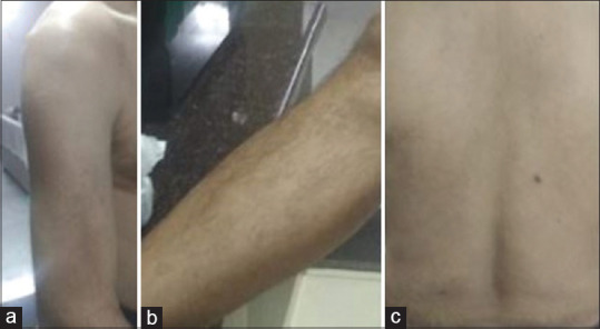 Patient presentation at the 6-month follow-up showing successful resolution of symptoms, (a) arms, (b) leg, and (c) back