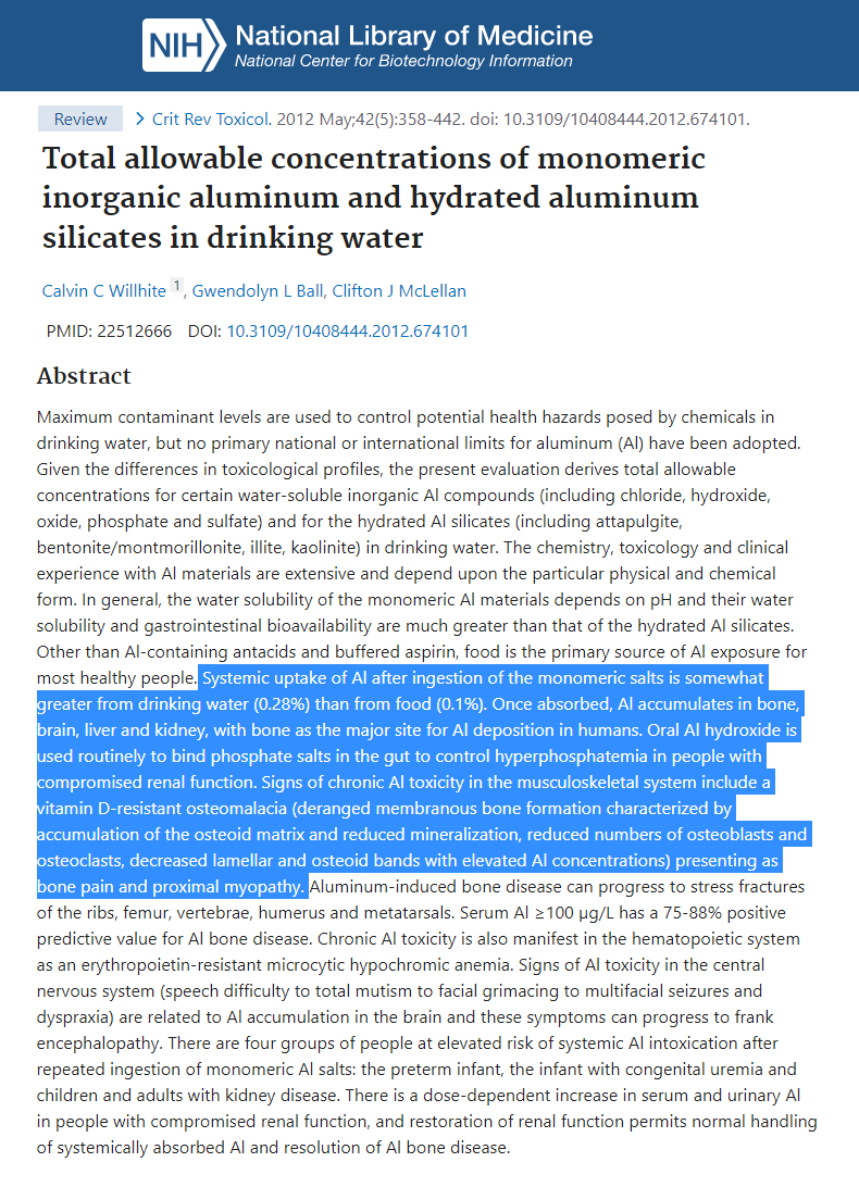Maximum contaminant levels are used to control potential health hazards posed by chemicals in drinking water, but no primary national or international limits for aluminum (Al) have been adopted. Given the differences in toxicological profiles, the present evaluation derives total allowable concentrations for certain water-soluble inorganic Al compounds (including chloride, hydroxide, oxide, phosphate and sulfate) and for the hydrated Al silicates (including attapulgite, bentonite/montmorillonite, illite, kaolinite) in drinking water. The chemistry, toxicology and clinical experience with Al materials are extensive and depend upon the particular physical and chemical form. In general, the water solubility of the monomeric Al materials depends on pH and their water solubility and gastrointestinal bioavailability are much greater than that of the hydrated Al silicates. Other than Al-containing antacids and buffered aspirin, food is the primary source of Al exposure for most healthy people. Systemic uptake of Al after ingestion of the monomeric salts is somewhat greater from drinking water (0.28%) than from food (0.1%). Once absorbed, Al accumulates in bone, brain, liver and kidney, with bone as the major site for Al deposition in humans. Oral Al hydroxide is used routinely to bind phosphate salts in the gut to control hyperphosphatemia in people with compromised renal function. Signs of chronic Al toxicity in the musculoskeletal system include a vitamin D-resistant osteomalacia (deranged membranous bone formation characterized by accumulation of the osteoid matrix and reduced mineralization, reduced numbers of osteoblasts and osteoclasts, decreased lamellar and osteoid bands with elevated Al concentrations) presenting as bone pain and proximal myopathy. Aluminum-induced bone disease can progress to stress fractures of the ribs, femur, vertebrae, humerus and metatarsals. Serum Al ≥100 µg/L has a 75-88% positive predictive value for Al bone disease. Chronic Al toxicity is also manifest in the hematopoietic system as an erythropoietin-resistant microcytic hypochromic anemia. Signs of Al toxicity in the central nervous system (speech difficulty to total mutism to facial grimacing to multifacial seizures and dyspraxia) are related to Al accumulation in the brain and these symptoms can progress to frank encephalopathy. There are four groups of people at elevated risk of systemic Al intoxication after repeated ingestion of monomeric Al salts: the preterm infant, the infant with congenital uremia and children and adults with kidney disease. There is a dose-dependent increase in serum and urinary Al in people with compromised renal function, and restoration of renal function permits normal handling of systemically absorbed Al and resolution of Al bone disease. Clinical experience with 960 mg/day of Al(OH)(3) (~5 mg Al/kg-day) given by mouth over 3 months to men and women with compromised renal function found subclinical reductions in hemoglobin, hematocrit and serum ferritin. Following adult males and females with reduced kidney function found that ingestion of Al(OH)(3) at 2.85 g/day (~40 mg/kg-day Al) over 7 years increased bone Al, but failed to elicit significant bone toxicity. There was one report of DNA damage in cultured lymphocytes after high AlCl(3) exposure, but there is no evidence that ingestion of common inorganic Al compounds presents an increased carcinogenic risk or increases the risk for adverse reproductive or developmental outcomes. A number of studies of Al exposure in relation to memory in rodents have been published, but the results are inconsistent. At present, there is no evidence to substantiate the hypothesis that the pathogenesis of Alzheimer's Disease is caused by Al found in food and drinking water at the levels consumed by people living in North America and Western Europe. Attapulgite (palygorskite) has been used for decades at oral doses (recommended not to exceed two consecutive days) of 2,100 mg/day in children of 3-6 years, 4,200 mg/day in children of 6-12 years, and 9,000 mg/day in adults. Chronic ingestion of insoluble hydrated Al silicates (in kg) can result in disturbances in iron and potassium status, primarily as a result of clay binding to intestinal contents and enhanced fecal iron and zinc elimination. Sufficiently high doses of ingested Al silicates (≥50 g/day) over prolonged periods of time can elicit a deficiency anemia that can be corrected with oral Fe supplements. There is essentially no systemic Al uptake after ingestion of the hydrated Al silicates. Rats fed up to 20,000 ppm Ca montmorillonite (equivalent to 1,860 ppm total Al as the hydrated Al silicate) for 28 weeks failed to develop any adverse signs. The results of dietary Phase I and II clinical trials conducted in healthy adult volunteers over 14 days and 90 days with montmorillonite found no adverse effects after feeding up to 40 mg/kg-day as Al. Since the Al associated with ingestion of hydrated Al silicates is not absorbed into the systemic circulation, the hydrated Al silicates seldom cause medical problems unless the daily doses consumed are substantially greater than those used clinically or as dietary supplements. A no-observable-adverse-effect-level (NOAEL) of 13 mg/kg-day as total Al can be identified based on histologic osteomalacia seen in adult hemodialysis patients given Al hydroxide for up to 7 years as a phosphate binder. Following U.S. EPA methods for calculation of an oral reference dose (RfD), an intraspecies uncertainty factor of 10x was applied to that value results in a chronic oral reference dose (RfD) of 1.3 mg Al/kg-day; assuming a 70-kg adult consumes 2 L of drinking water per day and adjusting for a default 20% relative source contribution that value corresponds to a drinking water maximum concentration of 9 mg/L measured as total Al. A chronic NOAEL for montmorillonite as representative of the hydrated Al silicates was identified from the highest dietary concent