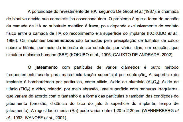 A literatura descreve diversas formas de se obter uma microtexturização do implante (plasmas de titanium e hidróxido de cálcio, anodização, jateamento, ataque ácido, laser e combinação de técnicas).