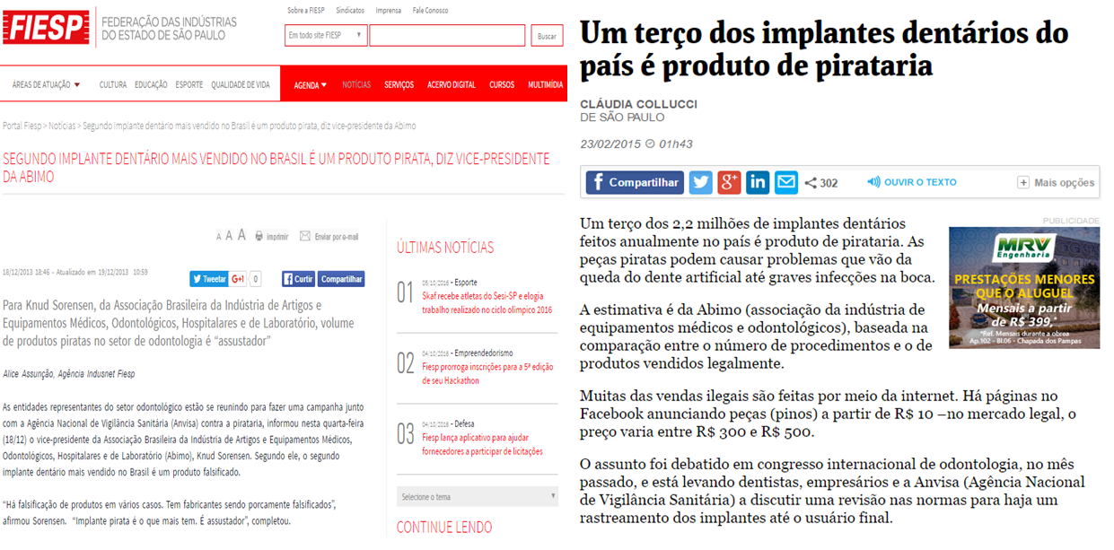 Segundo algumas notícias vinculadas na mídia, existem vários implantes e componentes protéticos sendo comercializados sem registro, ou seja, piratas.