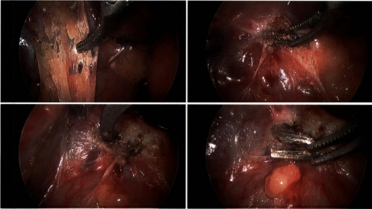 Considering the high possibility of nickel surgical clips retained during her cholecystectomy causing her symptoms, the decision was made to remove the surgical clips. A week after her visit, the patient had a diagnostic laparoscopy and removal of six metal surgical clips from her RUQ via fluoroscopic guidance (Figure11).