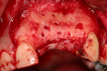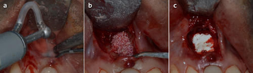 Após o jateamento, a superfície do implante e a área ao redor foram lavadas profusamente com solução fisiológica. A região foi enxertada com osso mineral bovino (Figura 4B) e coberta com uma dupla camada de membrana absorvível de colágeno (Figura 4C). Um enxerto de tecido conjuntivo foi posicionado sobre a área antes da sutura.