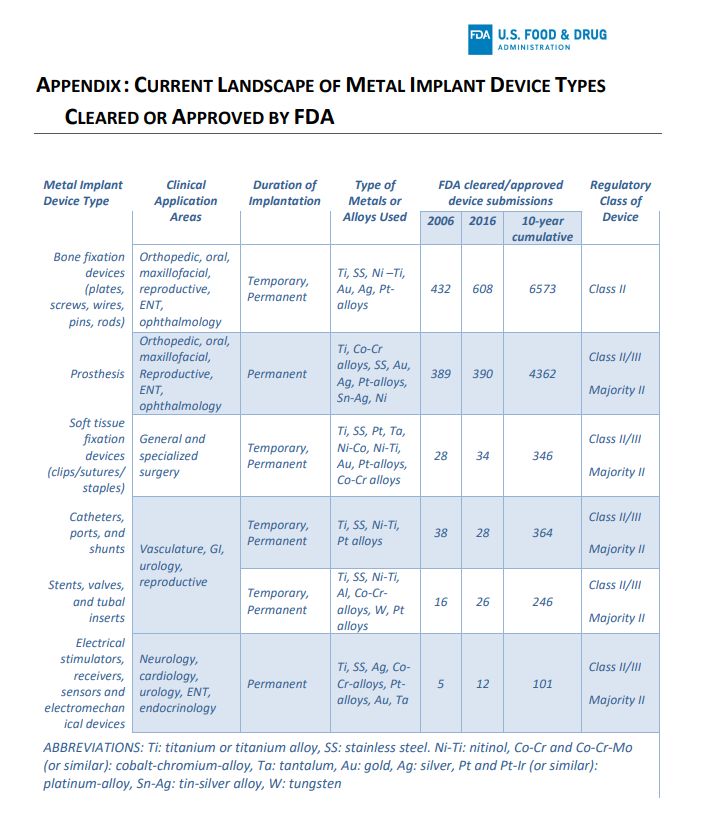 These results, along with clinical data in certain circumstances, are provided to, and reviewed by FDA prior to market authorization. In the past several years, FDA has undertaken extensive postmarket reviews of data associated with specific metal-containing implants after safety concerns were raised including for metal-on-metal (MoM) total hip arthroplasty (THA) systems and the Essure System for permanent birth control.1 In those cases, the potential role of metal components in the development of local and systemic adverse events had been questioned.