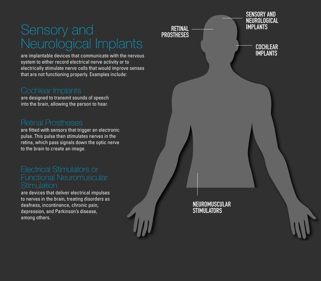 These advantages have led to continued interest in the development of implanted devices over the last century. The term “implant” refers to a wide variety of different medical devices, from solid metal implants, such as orthopedic plates/screws, to bioelectronics such as pacemakers or neurostimulators.