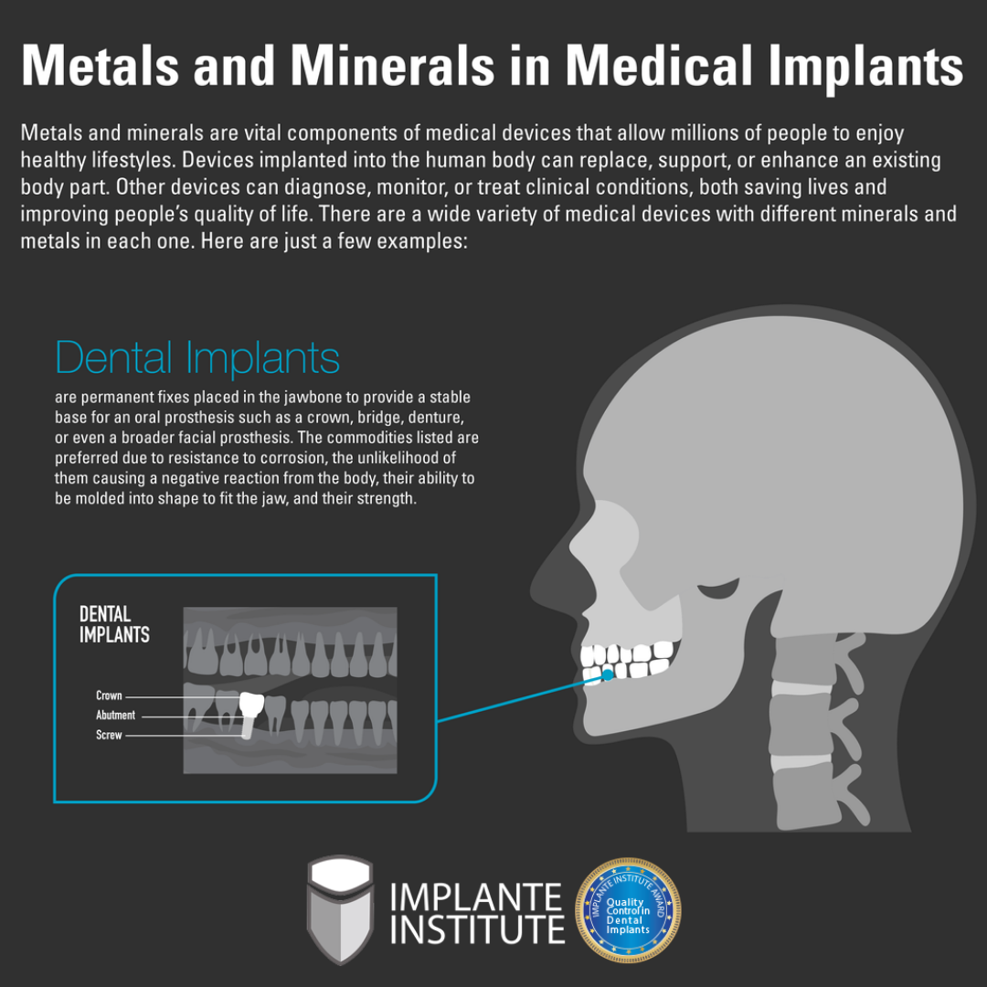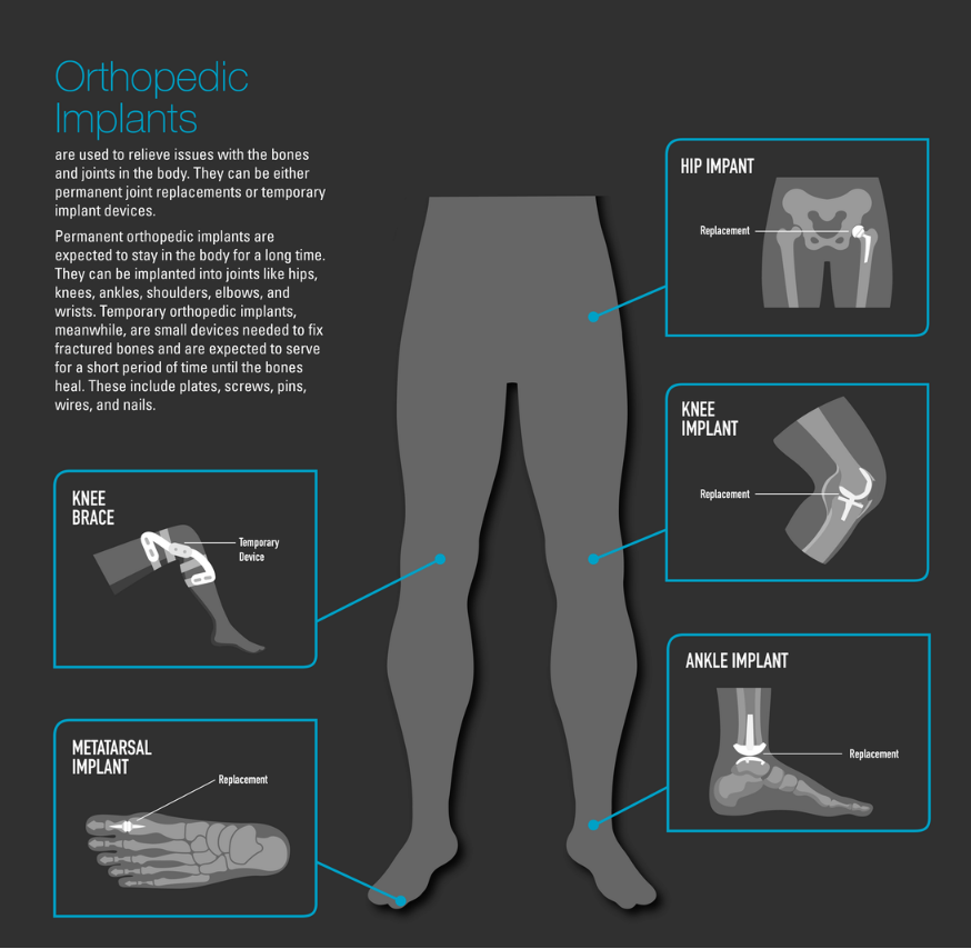 Some implants are temporary and may be designed to be removed or replaced, while others are meant to be permanent (i.e., not intended to be removed). For this paper, implants are defined as medical devices that are placed into a surgically or naturally-formed cavity of the human body and are intended to remain there after the procedure for an extended period. This review primarily focuses on implants with metal parts or components that have contact with body tissue. Implant components based on metallic elements are chosen as a biomedical material because they have numerous advantages over other materials, including high mechanical strength, durability, good thermal and electrical conductivity, ductility, and chemical/biological compatibility.