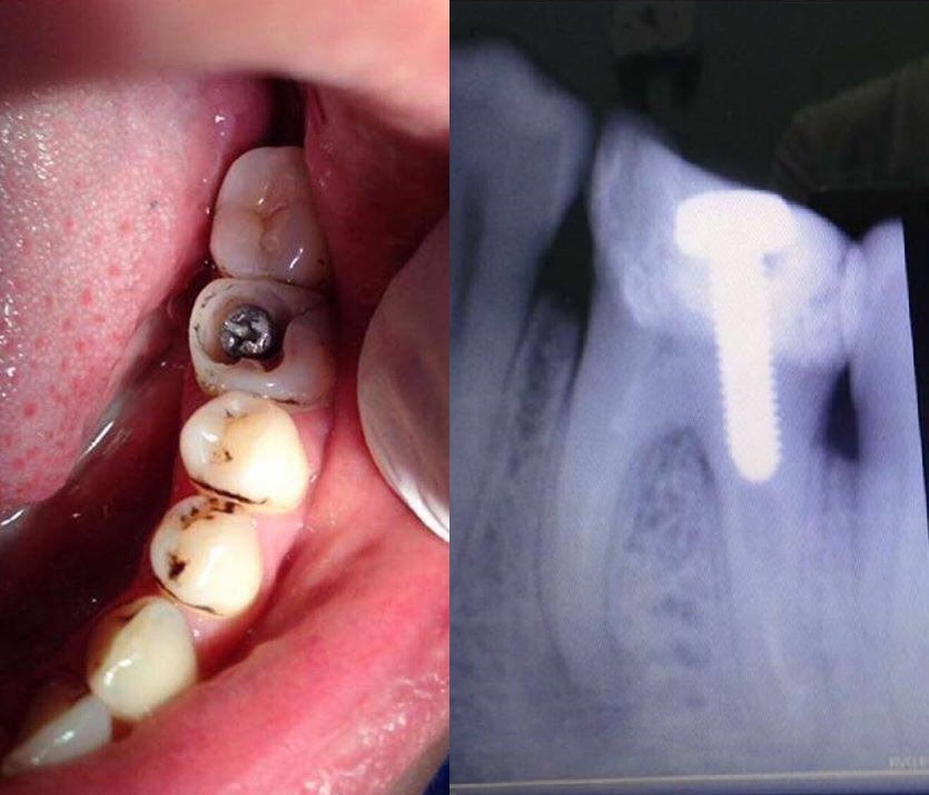 Procure no site do Conselho Federal de Odontologia http://cfo.org.br/servicos-e-consultas/profissionais/ para saber se o profissional está cadastrado para que não aconteça como no caso abaixo, onde foi colocado um simples parafuso (aquele de loja de material de construção) ao invés de um pino intracanal (vendido em lojas especializadas para dentistas).