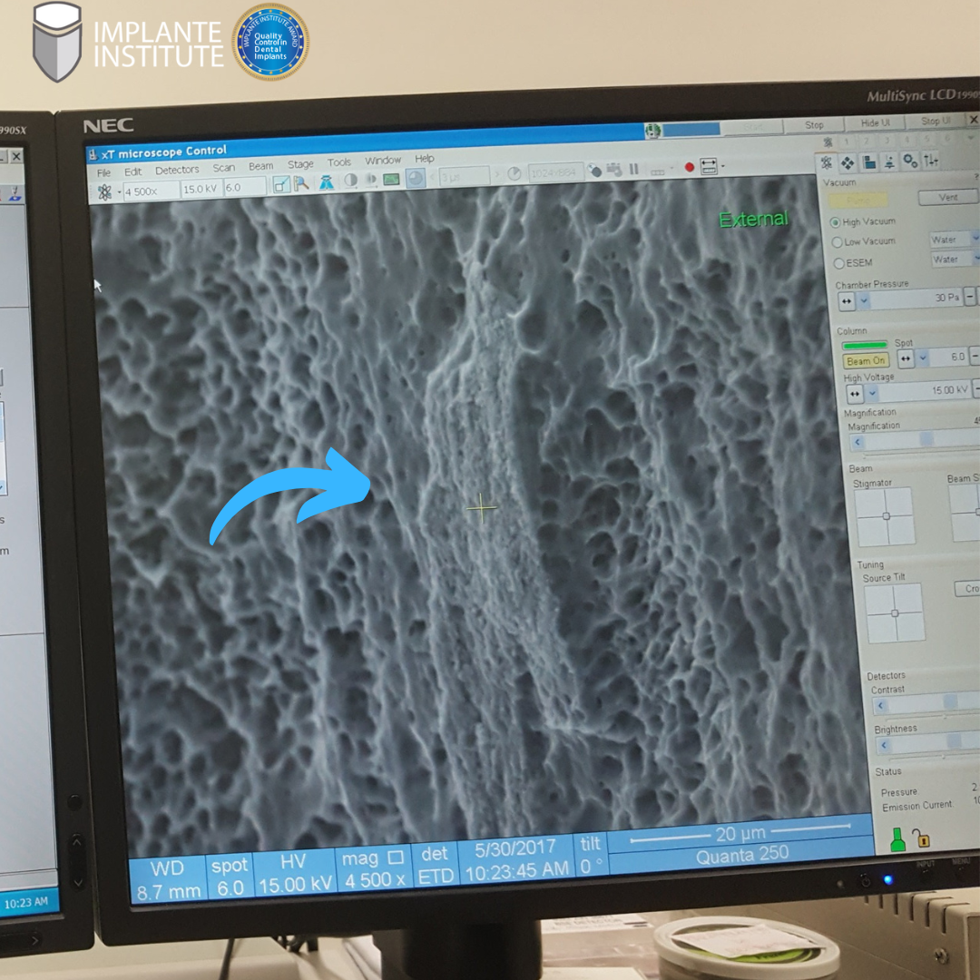 Vimos no post anterior que esse implante é de titânio puro, mas note nesse aumento de 4500x que nessa parte da seta o tratamento de superfície não ficou com rugosidade.