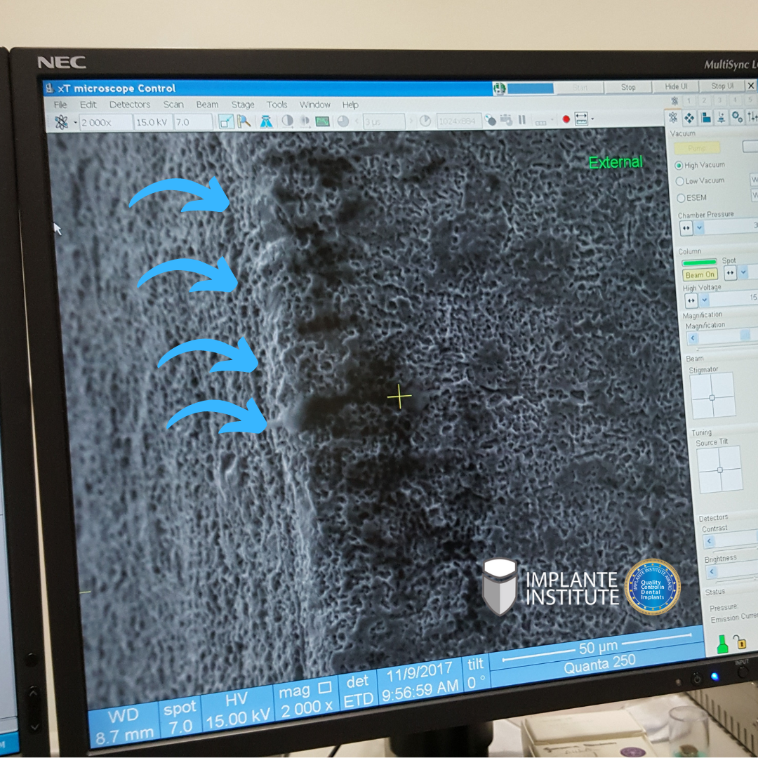 Vejam essa análise, perceba que algo raspou e depositou na superfície do implante.